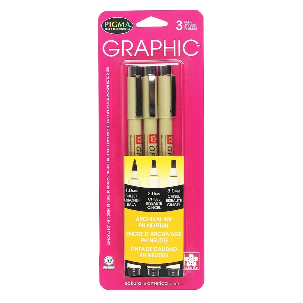 Create stunning graphic art, sketches and illustrations with these Graphic pens from Pigma. You can also use them for fabric art, scrapbooking and archiving precious memories in your journals and diaries. With a variety of nibs, these pens are great for techniques like fine lines or lettering, shading and coloring.