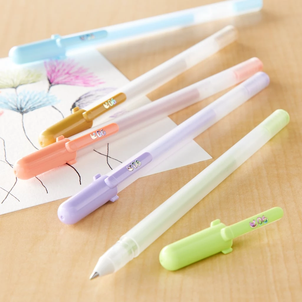 The creamy, smooth, opaque ink is perfect for writing in journals, decorating cards, pattern drawing, or detailed accents. All colors are bright on white paper and produce outstanding effects on quality black paper. Create fine lines on any artwork and leave a colorful mark thatβs uniquely your own. Colors include: pale brown, yellow ochre, leaf green, sky blue and lavender.