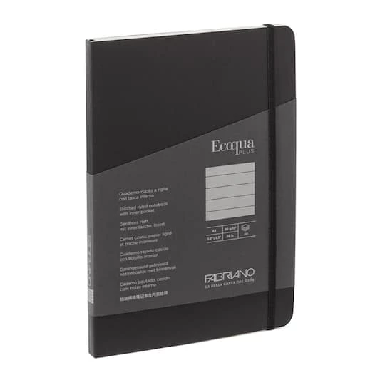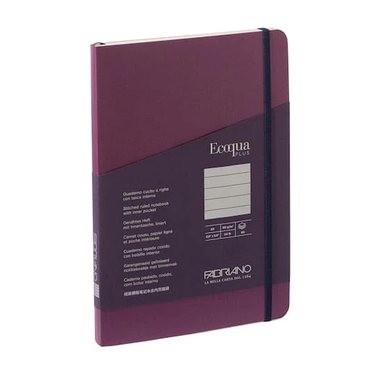 This stitch-bound notebook is 100% Italian made and has a colorful lightfast cover with a canvas-like texture and sewn spine. It contains eco-friendly, FSC certified, chlorine-free and acid-free Bioprima white paper with excellent opacity. The notebook features a matching elastic band closure, a textile bookmark, and a gusseted paper pocket. The belly band identifies the range and describes the product in eight different languages.