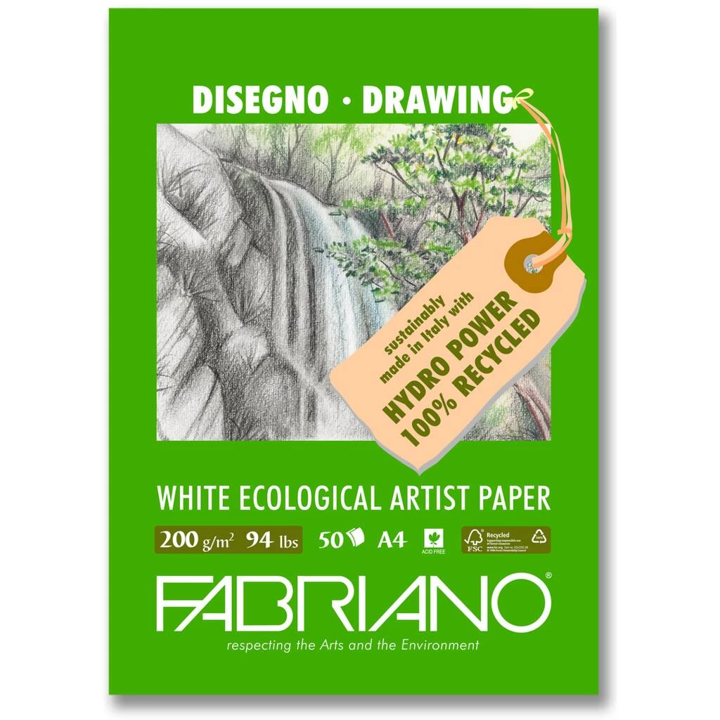 This Fabriano Eco White Drawing & Sketching Pad is created from bright white art paper made of 100% certified recycled, post-consumer waste and 50% hydro-power production with no chlorine bleach. Its production saves one tree per every 80 pads, prevents 9,000 tons of Co2 per year, and spares 14,000,000m3 of methane annually. It is excellent for the earth and drawing and sketching needs.