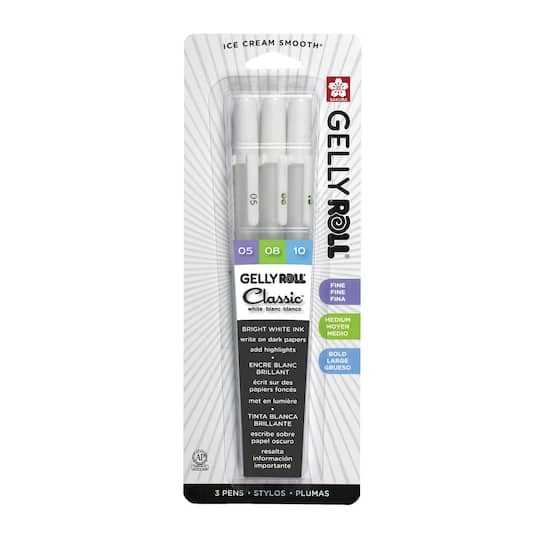 Create striking highlights on your creative art projects with these white gel pens from Gelly Roll. They are also perfect to write or illustrate on dark paper. You can use them on your handmade greeting cards and other papercrafts.