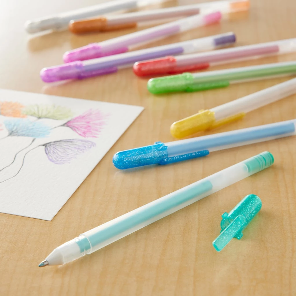 Add reflective shine to your handwriting and illustrations with these metallic gel ink pens. These shiny, opaque pens write on both light and dark papers as well as glossy and matte surfaces, including coated paper, photographs and vellum. The archival quality, pigment-based gel ink ensures that your work (and the metallic sheen) will last for years, so put pen to paper and create an artistic, polished mark thatβs uniquely your own. Great for letters, illustrations, scrapbooking and other crafts, the ink is waterproof and chemical and fade resistant, it wonβt smear, and it has no feathering or bleed-through on most papers.Β