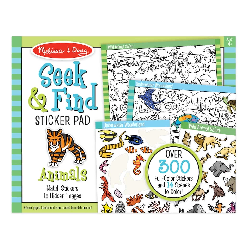 This fun pad is a seek-and-find game, a coloring pad, and a sticker pad all rolled into one! Match more than 400 full-color stickers to hidden objects on 14 animal-themed pages, then color in the detailed scenes with pencils, markers, or crayons to create one-of-a-kind pictures. Sticker pages are color-coded and labeled to match scenes. The detail-rich scenes include a desert, forest, ocean, pond, rainforest understory, rainforest treetops, dinosaurs, tide pool, arctic, marsh, farm, barn, coral reef, and safari. Perforated edges make it easy to remove sticker pages to match to scenes.