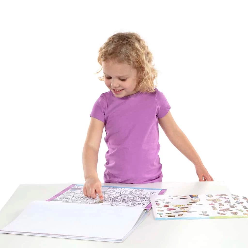 This fun pad is a seek-and-find game, a coloring pad, and a sticker pad all rolled into one! Match more than 400 full-color stickers to hidden objects on 14 town-themed pages, then color in the detailed scenes with pencils, markers, or crayons to create one-of-a-kind pictures. Sticker pages are color-coded and labeled to match scenes. The detail-rich scenes include a farmers market, hospital, highways, park, school, airport, amusement park, restaurant, mall, museum, cafΓ©, construction site, bus station, and firehouse. Perforated edges make it easy to remove sticker pages to match to scenes.
