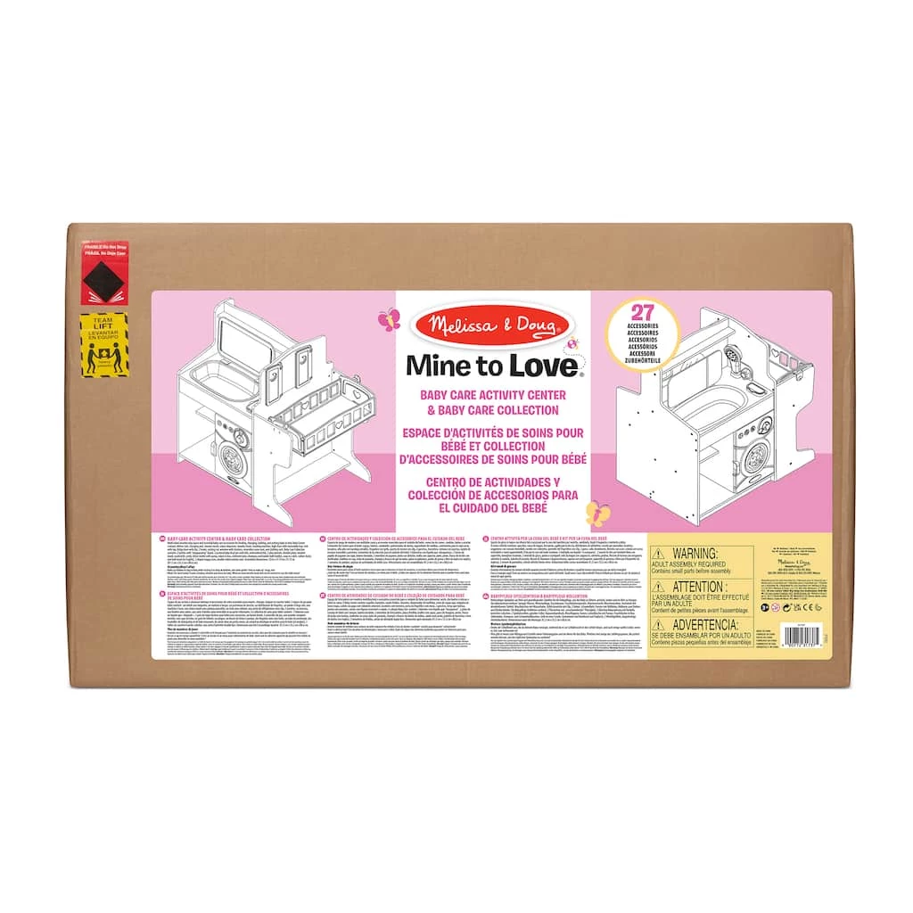 This multifunctional doll and stuffed animal wooden baby care activity center, combined with realistic play feeding, bathing, and changing accessories, has everything kids need to nurture and play with their special babies! The sturdy wooden center includes a kitchen with refrigerator, sink, and high chair. A changing and bathing area features a bathtub with spray nozzle and flip-down changing mat, a mirror, wipes dispenser, laundry chute, and washing machine with clicking dial. The nursery area has a rocking cradle, clothing storage, and shuttered window with a card that can be flipped to a daytime or nighttime scene. Stock the center with feeding accessories, including an easy-close, embroidered bib to keep baby clean, a divided dish, utensils, and baby food jars. ”Disappearing” liquid bottles add to the fun! The realistic bathing and diaper-changing accessories sized just right for dolls and stuffed animals include shampoo and bubble bath bottles, play soap, an owl-hooded towel, wipes, diapers, and more. Thereβs even a rubber ducky and bath book! Kids three and older will love having their very own space and supplies to nurture and care for their babies.