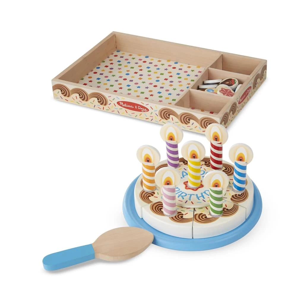 Every day’s a celebration with our festive birthday party! This wooden set includes six ready-to-cut slices of cake, removable candles and toppings, and a cake plate and server. Use the serving knife to cut a piece and hear a slicing sound! All 34 pieces store neatly in the wooden box until the next celebration. 34 piece set. Velcro tabs hold pieces together, then “slice” apart. Includes extension activities for play and learning.
