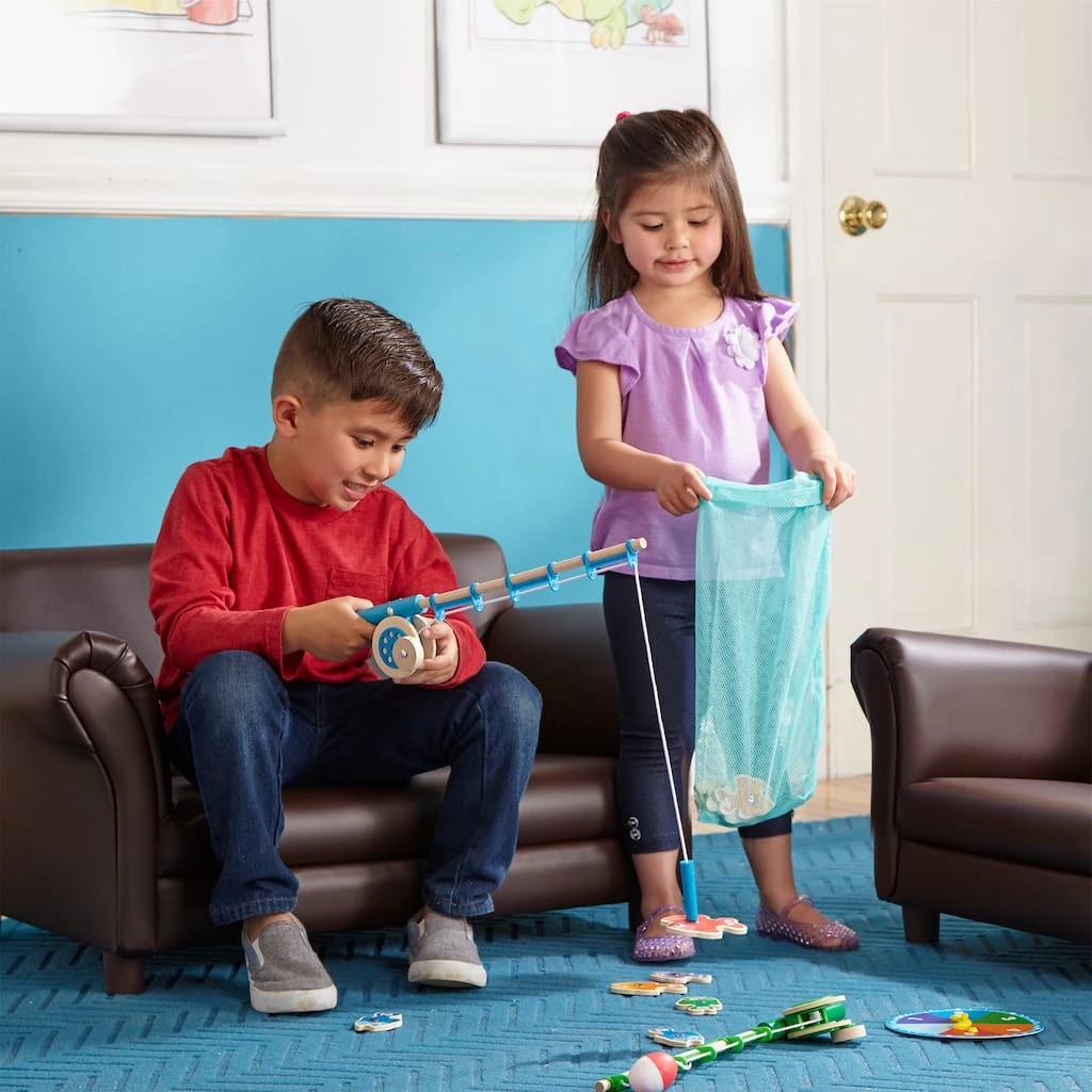 Catch some laughs and learning with this wooden magnetic play set–complete with working wind-up reel! The 10 magnetic fish are numbered and patterned to enrich matching, sorting, and counting activities, and two wooden rods make collecting them a blast! Kids can use the spinner to play as a game, or just have fun collecting the pieces over and over again. Either way, there’s plenty of fun in this sea!