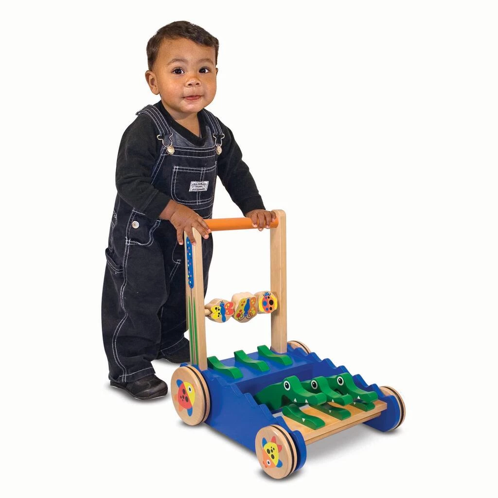 Three alligators will charm toddlers as they take turns chomping with every step! This multisensory wooden push toy encourages walking and discovery. Graphic details feature cattails on the handle supports, fish on the wheels and spinning butterfly and ladybug beads.