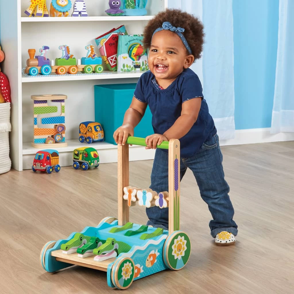 Get playtime rolling with 3 friendly alligators who take turns chomping with every step toddlers take. Easy to assemble, the sturdy wood walker has an easy grip handle, non-skid wheels, and includes 3 wooden buggy beads to grasp and spin. First Play toys feature bright colors, bold patterns, and whimsical designs that boost motor skills while sparking imagination and wonder, right from the start.