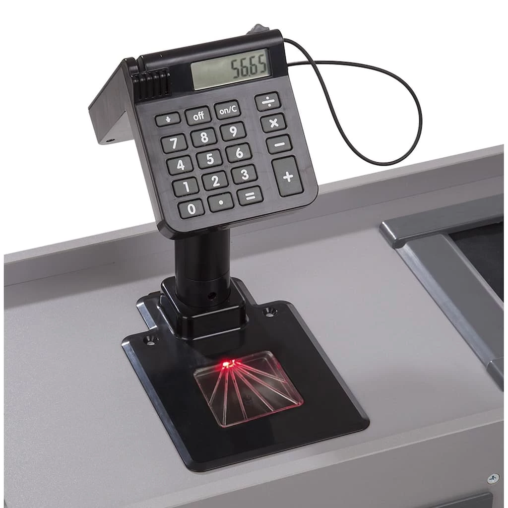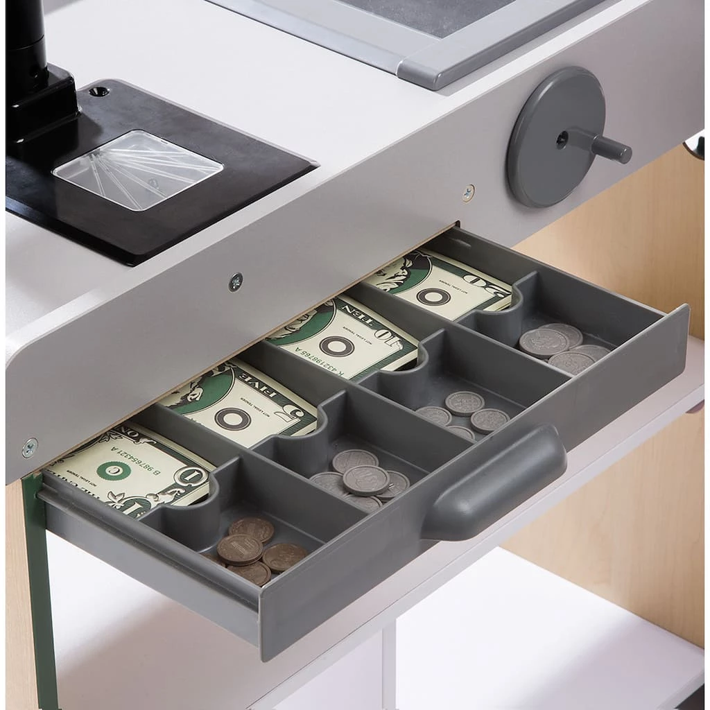 Shopping and playful purchasing is exciting at the sturdy wooden Fresh Mart Grocery Store! The free-standing play space with smooth, curved corners and edges lets customers three and older browse the shelves and pay for purchases on one side, and allows the grocer to ring up items on the other. Realistic features include beeping “scanner,” a hand-crank conveyor belt, a card-swiping machine, a keypad/calculator, and cash drawer. Kids are sure to find everything on their shopping list at this friendly neighborhood grocery store! Free-standing sturdy wooden grocery store for playful shopping.