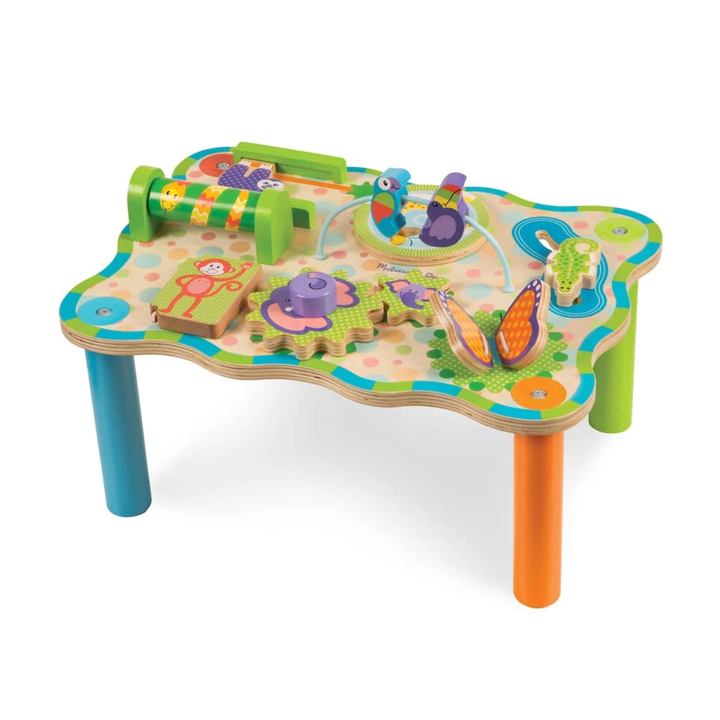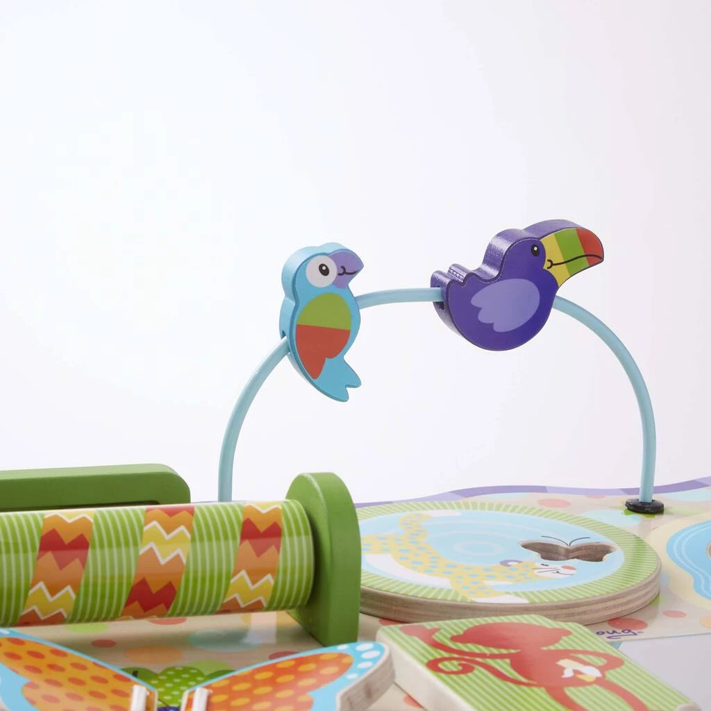 This hands-on multi-activity table keeps kids 12 months and older engaged and entertained, while encouraging important developmental skills. Features include gears to turn, a tube to roll, beads to slide, flaps to open, a wheel to spin, and easy-to-grasp pieces to flip, push, and pull! Sturdy wooden construction, paired with whimsical jungle-themed designs, make this a long-lasting and welcome addition to any playroom. First Play toys feature bright colors, bold patterns, and whimsical designs that boost skills while sparking imagination and wonderβright from the start!