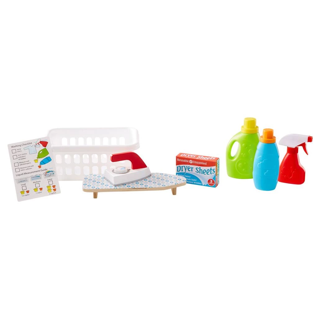 Kids will have loads of fun playing house with this these realistic laundry accessories! The 14-piece set includes a sturdy take-along basket to hold all the supplies and a reusable activity card to check off chores. Kids three and older will love spraying, measuring, and pressing with a stain remover spray bottle that can be filled with water, detergent and fabric softener bottles with removable lids, a box of three pretend dryer sheets, and a wooden iron and ironing board. Laundry day has never been such fun! Pretend play wooden iron and ironing board and laundry accessories in a take-along basket.