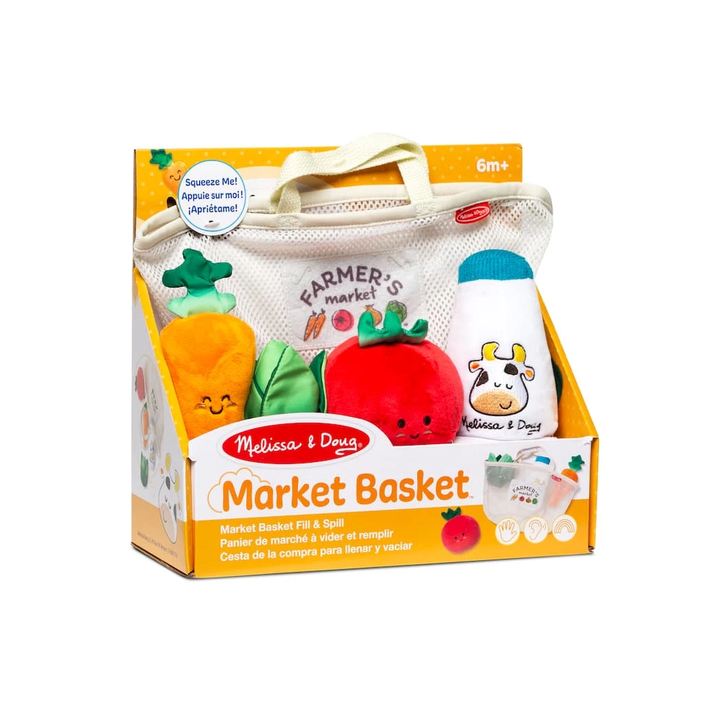 Add a fresh twist to playtime with touchable, tactile farmer’s market play food favorites delight the senses! Fill the mesh mini-grocery tote with a squeaking carrot, chiming milk bottle, rattling tomato, and crinkling lettuce, all featuring sweet, friendly faces. Pull out the easy-to-grasp pieces and refill the tote again and again! The Market Basket Fill & Spill is an engaging way to help infants six months and older develop important sensory, fine motor, and color recognition skills. Melissa & Doug infant and toddler toys inspire “a-ha!” moments of discovery. Adorable, diverse characters and a variety of fun shapes and textures encourage exploratory, skill-building play.