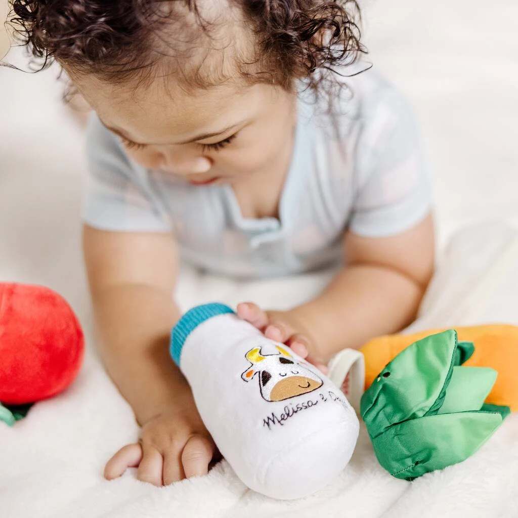 - Includes mesh tote, plush milk bottle, Crinkle lettuce, tomato rattle and squeaking carrot