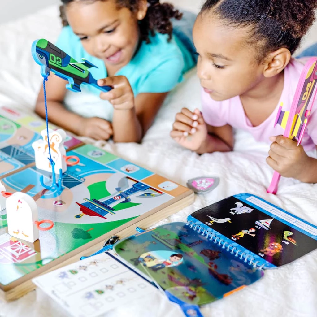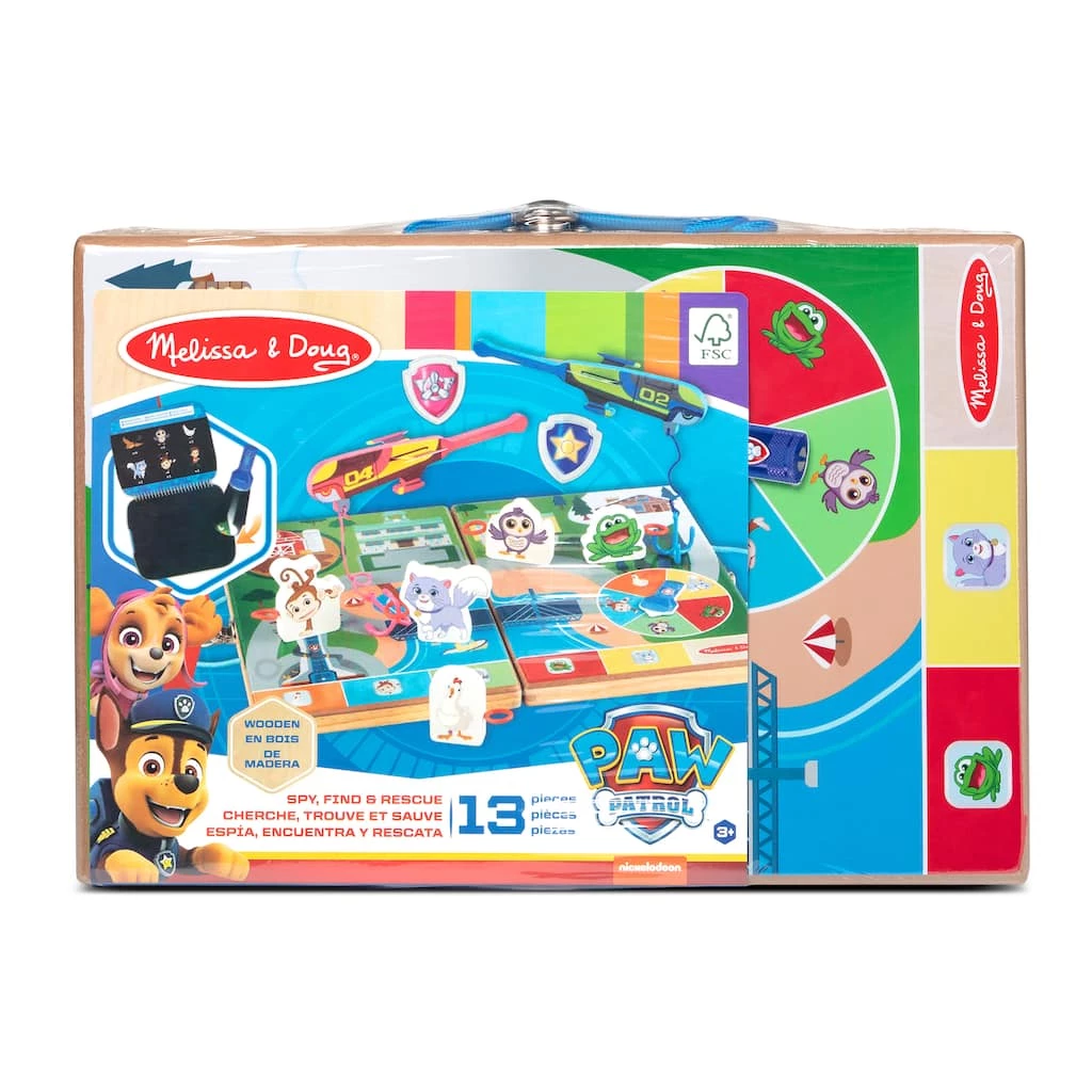 Join super spies Chase and Skye from PAW Patrolβ’ in fun search and rescue missions with this wooden take-along play set! Place wooden play figures on the wooden fold-out game board, spin the spinner, and use the drone-shaped fishing rods with matching badges to hook and move the indicated character to its safe spot! Play against an opponent or work together to rescue all the characters! The Flashlight Finder Pup Pad offers more search-and-find activities. All pieces store in the wooden take-along case. PAW Patrolβ’ is always ready to help, inspiring preschoolers with a blend of teamwork, adventure, and humor as they develop social, emotional, and developmental skills through play.