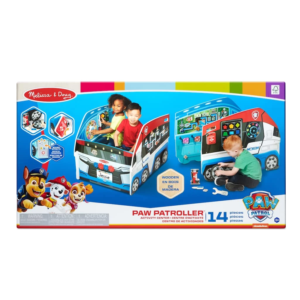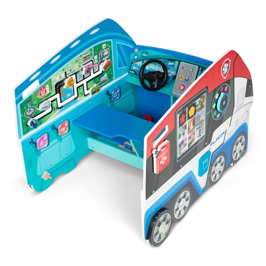 Climb in this multi-sided sturdy wooden play space for countless pretend play missions with the PAW Patrol™! Kids three and older can immerse themselves in the world of PAW Patrol as they spin gears, flip double-sided puzzle tiles, ”fill” and change flat tires with a wooden pump and tools, and slide badges and pups through a double-sided slider maze. Sit on the bench and spin the steering wheel and press the gas and brake pedals! Press dashboard buttons to turn on and off a start engine sound, microphone (press to record, release to play back), locator (zoom sound), and phone (ring sound). PAW Patrol is always ready to help, inspiring preschoolers with a blend of teamwork, adventure, and humor as they develop social, emotional, and developmental skills through play.