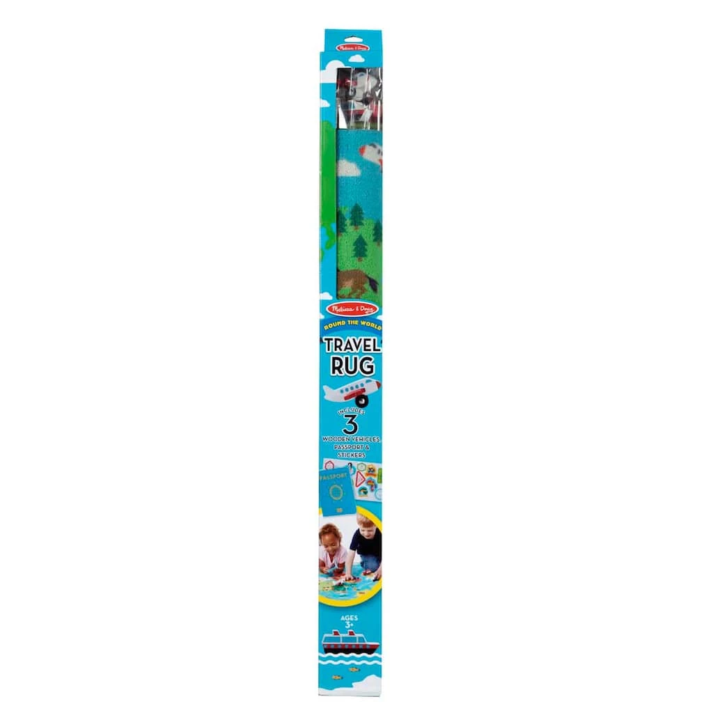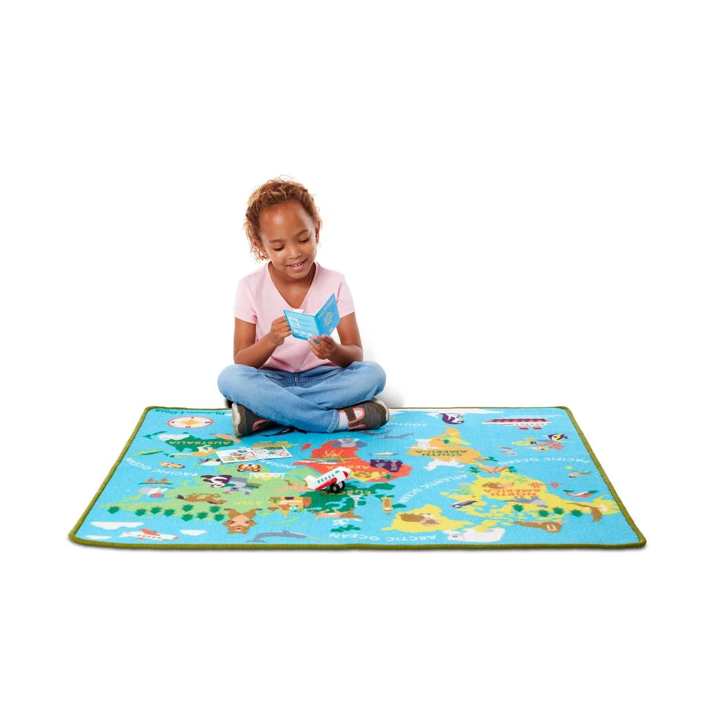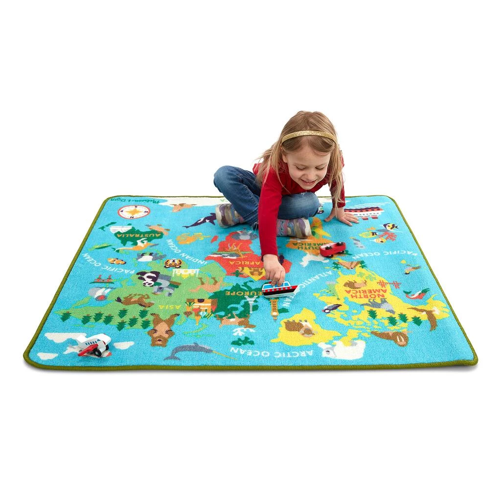 Get ready for exciting globe-trotting adventures with this sturdy, colorful world map play rug! Durably made to look great for countless playtimes to come, the woven rug with reinforced border binding and skid-proof backing comes with three wooden vehicles (car, airplane, and boat) for traveling across the world, as well as a passport with stickers to keep track of places visited! The illustrated map features labeled continents and oceans, native animals, points of interest, a compass rose, and more to give lots of options for creative play. Its large format is big enough for multiple kids and lots of play pieces.