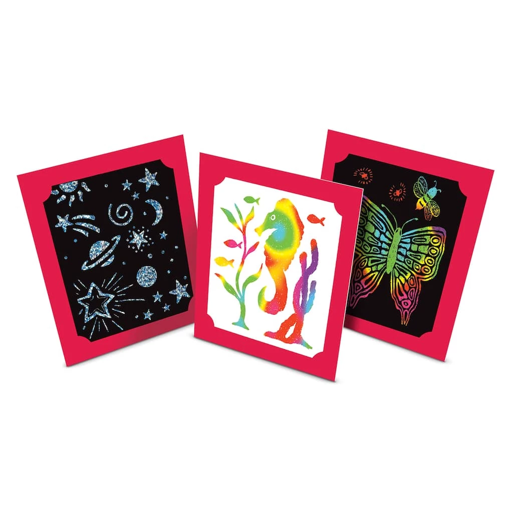Explore the best of Scratch Art! Scratch Art hides colors and patterns beneath a matte coating, plus a wooden stylus to reveal them with a simple scratch. This all-inclusive kit includes supplies for 16 stunning artworks with a variety of backgrounds.