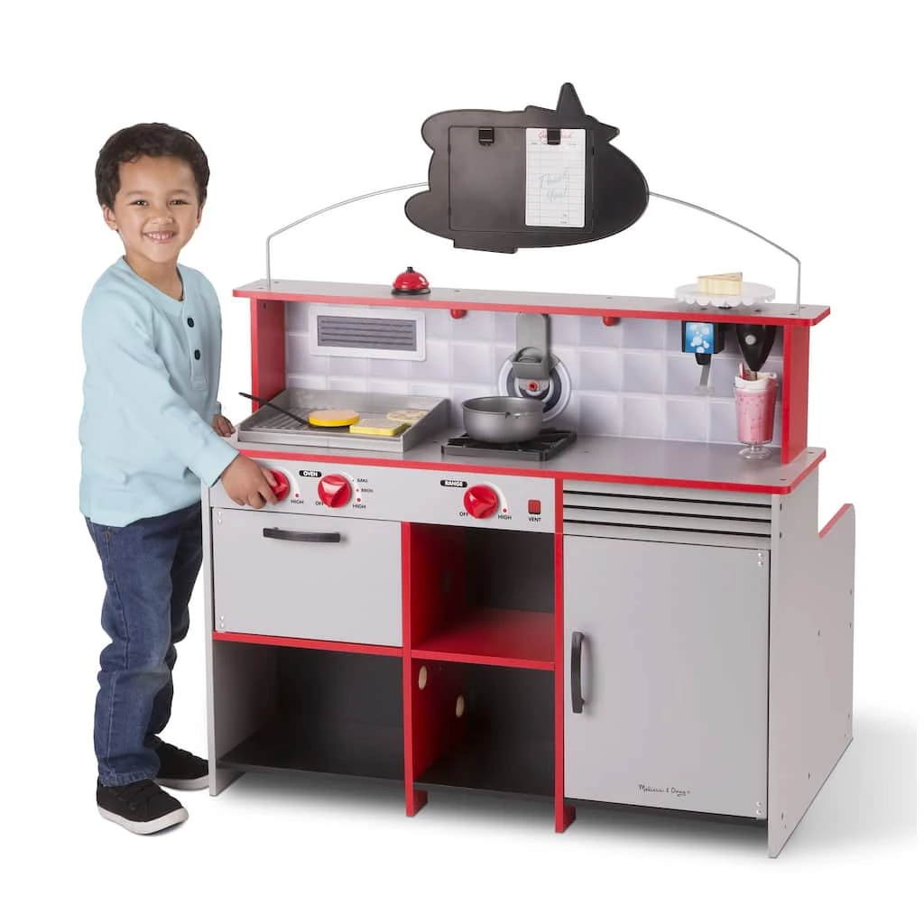 Have twice the fun at the Star Diner! This sturdy, double-sided wooden play space lets kids cook and serve from the kitchen side, and order and enjoy a meal on the booth side. The kitchen, with an extra-large oven, realistic burners and dials, a two-shelf refrigerator, and plenty of counter space has fun details like a drink dispenser and moving milkshake maker. At the two-seat booth, customers three and older can spin the jukebox dial to choose their favorite type of music, then drop the included coin in the slot. The coin lands in a collection tray on the other side!