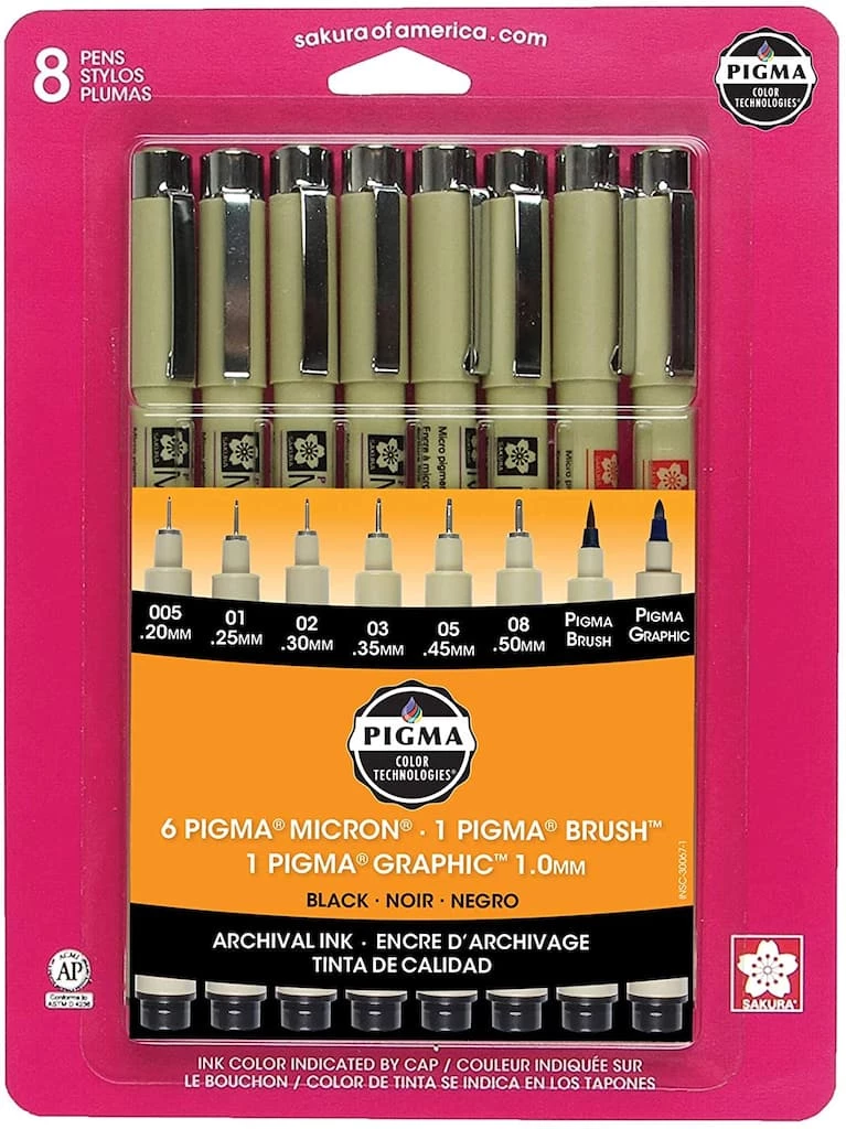 Sketch anime characters or draw detailed designs with these Sakuraยฎ Pigmaยฎ Micron Pens. These black pens use archival-quality ink that dries quickly and resists fading and bleeding. Apt for sketching and illustrating projects, these eight pens have different nib sizes and tip styles.
