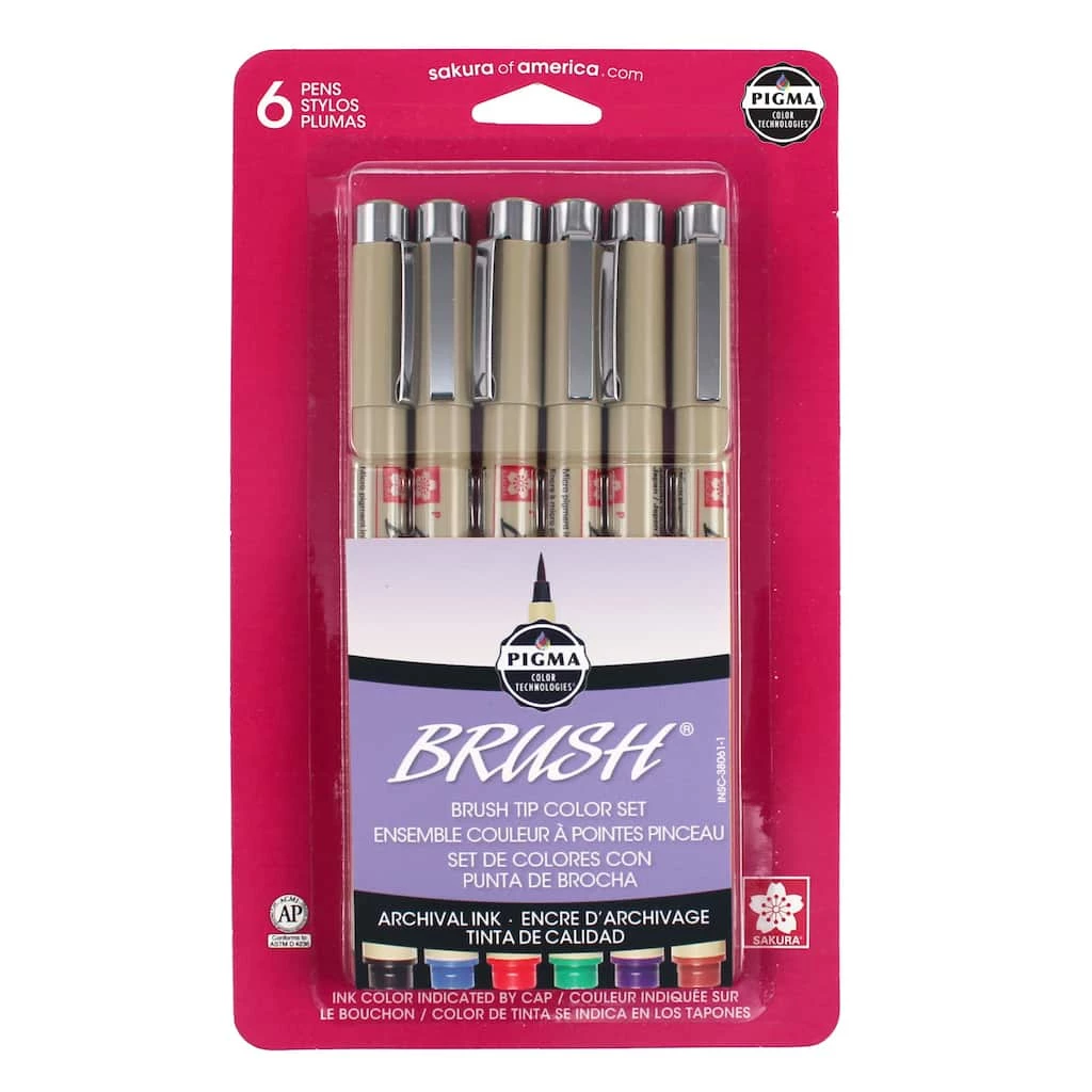 Developed to meet the needs of calligraphers and free-hand artists, these brush-tip pens also work well with rubber stamps to produce permanent ink impressions. The ink will not bleed through most fine paper and is suitable for archival application. This set includes Pink, Orange, Purple, Brown, Green, Red, Blue and Black.